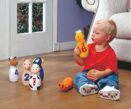 Watch your little one laugh, giggle and grin while trying to knock down these animal "pins" with the brightly colored ball. Just the right size for little hands, these cute farm creatures - cow, pig, cat, sheep, dog and duck - will become your child's favorite friends. For many hours of open-ended play and cognitive development, each critter makes one of three engaging rattle sounds when your little one shakes it. Features: Six fabric farm animals. Plush ball with chiming sound. "Pins" rattle when shaken. 2 month manufacturer's warranty. Large numerals on each animal help introduce the concept of numbers and counting when your child is ready. As your child grows, so does the fun.