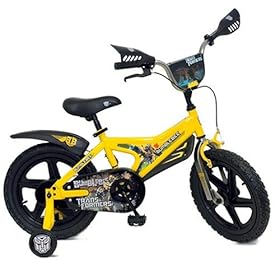 View Products DetailsThe Kent 71632 Transformers Bumble Bee 16-Inch Boys Bike is an ideal bicycle for boys who have just learned how to ride a bike. This Official Transformers Movie bicycle offers a vibrant yellow and black motif that resembles Bumble Bee, one of the heroic Autobots from the 2007 blockbuster. The bike has small, 16-inch wheels and comes with a pair of sturdy, removable training wheels, which are intended to assist young riders and ensure maximum safety. A double-guard chain guard prevents dangerous chain interference and wheel jamming for added safety. It also features mag wheels, handlebar decal plate, rear fender, and both a rear coaster brake and a front handbrake. The seat height is adjusted with a quick release seat clamp.